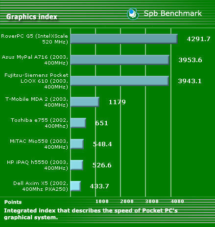 Еще один важный тест - тест графики, ведь просмотр видео - одна из наиболее часто используемых опций в смартфонах, коммуникаторах и КПК. Вот его рузультат: