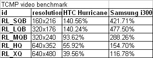 Огромное преимущество по тесту производительности видео в программе TCPMP по сравнению с HTC Hurricane объясняется частотой процессора и заточенностью плеера под Wireless MMX.