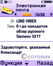 По части MMS аппарат проигрывает нокии 6600 - не поддерживает слайды (они же страницы, они же кадры) - короче, однокадровый сервис. В остальном - приемлемо работает, хотя некоторые картинки вставляться отказывались, мотивируя отказ "поврежденностью" или "некорректным форматом". В чем тут замес - я так и не понял. Возможно, глюк ПО телефона, потому как никаких несоответствий формата или повреждений в проверяемых картинках не было. E-mail сервис страдает двумя болезнями: нелюбовью к кодировке Koi8-R и неумением хранить для одного ящика два логина и пароля. В результате для тех мейл-серверов, где логин и пароль для SMTP и POP различаются, приходится создавать два почтовых ящика: один для получения, другой для отправки почты.