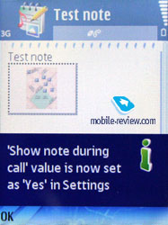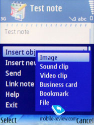 Приложение Active Notes можно видеть в этом аппарате, а также в Nokia E90. Отличие от обычных записок в предыдущих аппаратах разительное. Заимствована идеология MMS-сообщений, вы можете на лист добавлять различные объекты, начиная с текста и контактов, заканчивая фотографиями, записями диктофона и так далее. Заметку можно повесить в режиме ожидания на экран, но и тут нет особой новизны. Особый шарм функции придает возможность создать ссылку на записку для конкретного абонента из телефонной книги (включить также функцию показа заметок во время звонка). Представьте, вы готовите записку с перечнем того, что вам нужно спросить у вашего сотрудника, назначаете ее на номер и все. Когда он вам звонит или вы его набираете, вы сразу увидите все, что вы подготовили к этому разговору. Приятная функция, которую стоит освоить. Приживется ли она в телефонах – посмотрим, но идея интересна.
