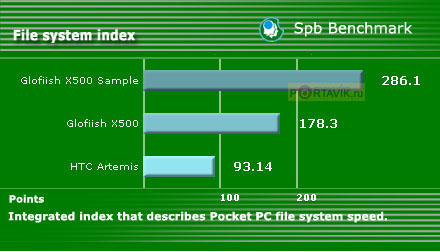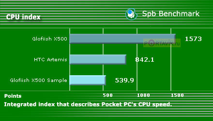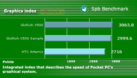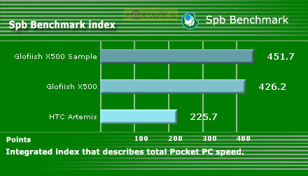 Однако и полученных результатов вполне достаточно для получения ясной картины. HTC Artemis выигрывает у Glofiish X500 лишь по двум параметрам «Graphics test: DDB BitBlt (frames/sec)» и «Graphics test: GAPI BitBlt (frames/sec)», да и то на небольшое значение. Но при этом его общая графическая производительность даже немного ниже, чем у X500.