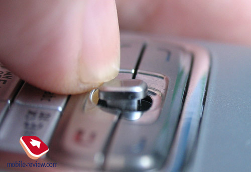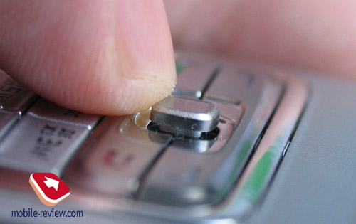 На левой боковой стороне находится окошко ИК-порта, ближе к нижнему торцу расположено отверстие для крепления ремешка. Разъем для MiniSD-карты вынесли на нижний торец, заглушка механическая, не откидывающаяся. Со стороны интерфейсного разъема Pop Port ее можно поддеть и сменить карту («горячая» замена поддерживается). Поддерживаются карты любого объема, в нашем аппарате прекрасно работала карта на 2 Гб.