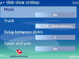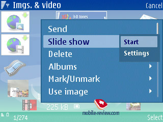 Из интересных особенностей данной модели можно отметить наличие нового режима слайд-шоу в галерее, ее можно запустить долгим нажатием соответствующей клавиши на боковой стороне. При переходе с картинки на картинку используется эффект увеличения, вы можете выбрать любую мелодию или мр3-файл, который будет играть в фоновом режиме. Галерея всегда отображается в горизонтальном режиме, она несколько запутанна для просмотра, особенно если у вас много файлов и требуется найти только один из них. Частичным выходом может являться создание своих альбомов изначально и занесение всех фотографий в них, но этот выход подойдет отнюдь не всем. Опция в виде Timeline-просмотра, как на телефонах Sony Ericsson, подошла бы этому аппарату на все 100 процентов. При просмотре отдельных картинок (короткое нажатие) вы будете иметь возможность сразу отправить их на печать или добавить в специальную корзину для печати.