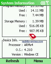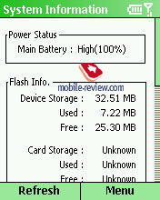 Объем встроенной Flash видимый пользователю – 32.51 Мб (из них доступно 25.30 Мб). Объем доступной оперативной памяти – 22.94 (из этого объема реально доступно около 8 Мб).