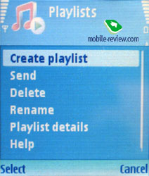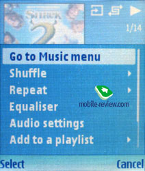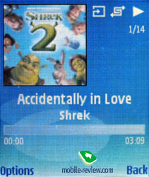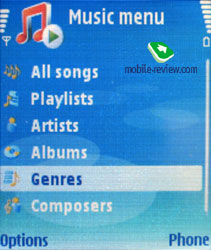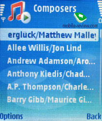 Музыкальные библиотеки N91, W950i имеют большое количество настроек, подробно о реализации вы можете почитать в обзорах на сайте. В случае с Nokia N91 все достаточно просто, общая философия – ничего лишнего. Вы можете посмотреть список всех песен, отфильтровать композиции по альбомам, исполнителям, композиторам, жанрам, посмотреть плей-листы (можно создать свой плей-лист и не один), работает поиск композиций по первым буквам в названии. Прослушиваемую композицию вы можете быстро установить на звонок. Доступны разные режимы воспроизведения: повтор одной композиции, всех композиций, режим shuffle; также вы можете установить картинку для отображения во время воспроизведения.