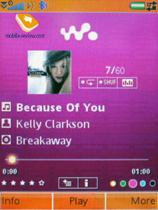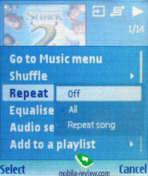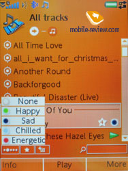 В работе с W950i немного другая философия: мы можем отфильтровать композиции по исполнителям, альбомам, настроению (прежде необходимо задать его для каждой композиции), посмотреть все дорожки, списки воспроизведения, задать автоматические списки воспроизведения по критериям (настроение, личный рейтинг). Также доступен просмотр только обложек альбомов, это красиво выглядит, но трудно достижимо в реальности (ваша библиотека на компьютере должна быть хорошо структурирована). В режиме воспроизведения вы можете одним щелчком по экрану задать настроение композиции, установить ее рейтинг, включить режим беспрерывного воспроизведения, shuffle. Проигрываемую композицию вы можете установить не только для звонка, но и для будильника, прямо из плеера отправить ее на другое устройство разными способами. Также любопытны функции «спящего» воспроизведения, когда плеер отключается через заданное количество времени (настоящий подарок для всех любителей послушать музыку в постели), установки закладок (это актуально для тех, кто слушает длинные композиции, аудиокниги). К тому же, есть возможность смены оформления плеера без смены темы, как у Nokia N91.