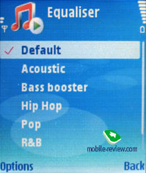 Немного о дополнительных настройках звука в обоих аппаратах. В Nokia N91 пользователь может воспользоваться эквалайзером, всего шесть предустановленных настроек (Acoustic, Bass Booster, Hip Hop, Pop, R&B, Rock), настройка «по умолчанию», можно поиграть с эквалайзером и самостоятельно, создав новый режим. Участники фокус-группы отметили, что работа эквалайзеров мало заметна, и самой оптимальной остается настройка «по умолчанию». Зато работа функции «Расширение стерео» (стереобазы) была хорошо заметна, как и эффект «Усиление басов», хотя мне кажется, что это больше психологические отличия, если бы я не показал, что собираюсь включить эту функцию, вряд ли они бы заметили ее работу. Смещение баланса участники группы не оценили, вернее, оценили как ненужную функцию.