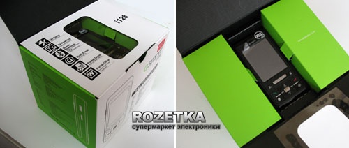 В начале скажем несколько слов о самой упаковке, коммуникатор поставляется в несколько необычной для подобных устройств коробке внешне, больше напоминающей упаковку Box-овых процессоров AMD для настольных компьютеров, по крайней мере цветовая гамма из белого зеленого и черного цветов вызывает подобные ассоциации.