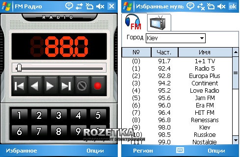 Утилита отвечающая за работу FM имеет простенький интерфейс с минимальным количеством настроек, собственно программа управления ТВ и FM тюнером это пожалуй одно и то же приложение имеющее различный интерфейс который выглядит по разному в зависимости от того к какому диапазону частот обращается встроенный приемник, по крайней мере интерфейс в котором пользователь получает доступ к избранным ТВ программам и радиостанциям одинаков и для тв программ и для радиостанций. Качество приема не идеальное но вполне приемлемое, приемником можно пользоваться в движении не испытывая дискомфорта, или огорчения по поводу частых помех. Приятной особенностью является возможность записи радиопередач, Причем, записывать можно как на карту памяти, так и в память устройства.
