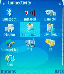 Поддерживаются 3 диапазона GSM, WCDMA 3G-сети, WLAN (802.11g, 802.11e и 802.11i), Bluetooth, ИК-порт. Одновременно можно пользоваться несколькими подключениями. С одним и тем же подключением могут работать несколько программ. У нас прекрасно проходила передача данных и работало модемное соединение по нестабильному и устаревшему ИК-порту (эдакий тест на прочность). С одной стороны, такое изобилие позволяет выбрать наиболее удобный вид связи, с другой – в зависимости от условий его придется изменять. Можно установить менеджер соединений, автоматически выполняющий работу по выбору наиболее предпочтительного вида связи, как только он становится доступным. Т.е. на улице это 3G; если базовая станция не поддерживает 3G или сигнал слишком слаб, включается GPRS; в офисе переключается на Wi-Fi. Заметим, что аудиоустройство может быть подключено лишь одно.
