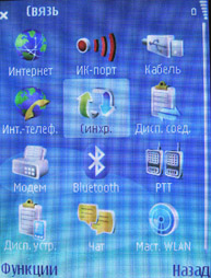 Соединения, передача данных. Аппарат поддерживает передачу данных через Bluetooth (поддержка профилей BIP-ImagePush, DUN GW, FT Server, HandsFree, Headset, OBEX, OPP Сlient, OPP Server, SIM Access-Server), но для любителей слушать музыку через беспроводную стереогарнитуру есть плохие новости: профиль A2DP не поддерживается. В меню передача данных выделена отдельным пунктом, и через него можно передавать совместимым с Nokia устройствам, например, список контактов.