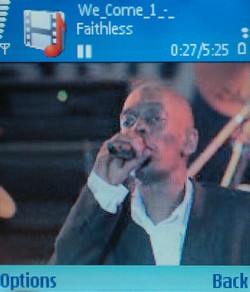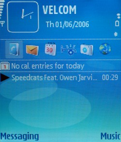 Меню устройства стандартно для всех последних смартфонов Nokia. Например, от меню побывавшего недавно в тестовой лаборатории Onliner N80 оно отличается лишь небольшим количеством программ. Да и те не установлены лишь потому, что N91 просто не поддерживает некоторые функции. Но и наш «пациент» может похвастаться уникальными чертами. В первую очередь, это плеер, который мы рассмотрим подробно, а также связанная с ним модификация меню. Последняя заключается в том, что при переключении песни ее название на пару секунд появляется чуть левее индикатора заряда аккумулятора. В дежурном режиме плеер превращается в маленькую полоску на десктопе, в которой отображается текущая песня, состояние плеера и т.д. (эту опцию можно отключить).