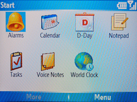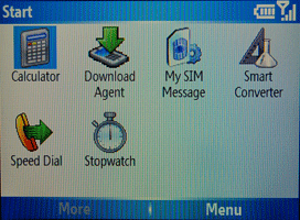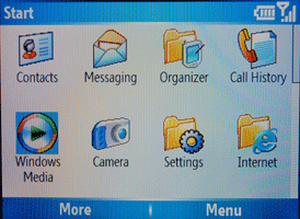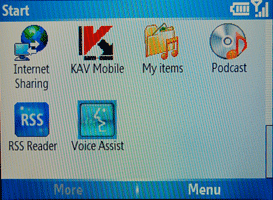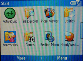 Меню выполнено вполне традиционно для смартофонов на базе Windows, даже иконки напоминают об одноименной ОС. Создавать свои пункты можно просто копируя нужную программу в папку главного меню. Но вряд ли это придется делать часто, так как каждая установленная программа создает свой пункт. Тем не менее, меню по умолчанию состоит из 20 пунктов: