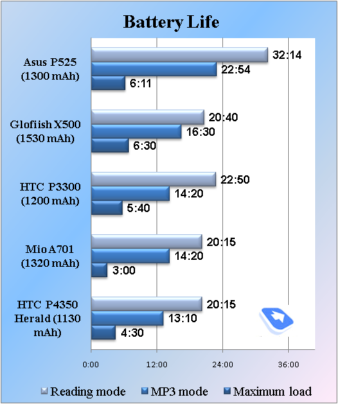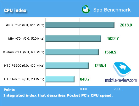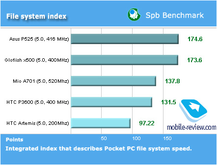 Мы провели традиционный тест пакетом SPB Benchmark. В силу того, что этот тест не дает объективной картины скорости устройств на WM 5.0, мы взяли из него лишь несколько типов данных. По производительности процессора Asus P525 находится на ожидаемо высоком уровне. С учетом возможности разгона процессора мощности устройства хватит для любых задач, выполняемых на ОС Windows Mobile.