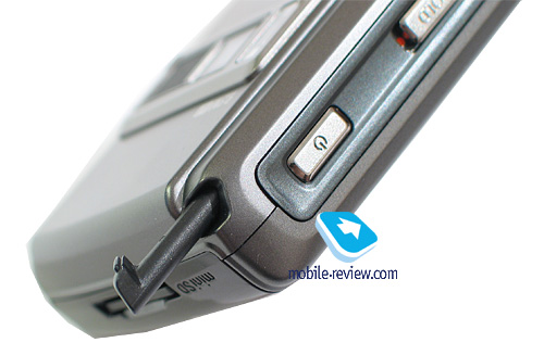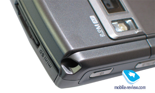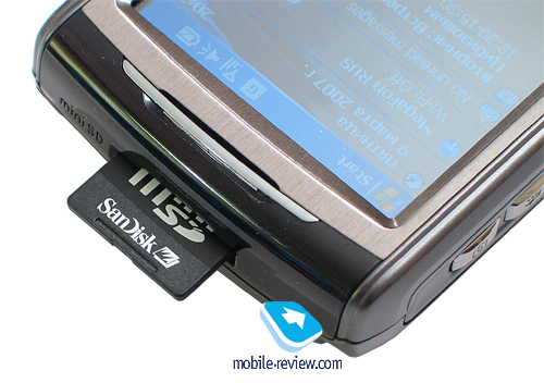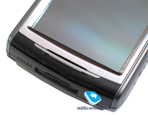 Обратимся к верхнему торцу коммуникатора. Здесь располагается разъем для карты памяти формата MiniSD. Стандарт SDHC аппарат не поддерживает, соответственно, максимально допустимый на сегодня объем карты – это 2 Гб. Разъем для карты ничем не прикрыт, карта вставляется до щелчка, после чего фиксируется.