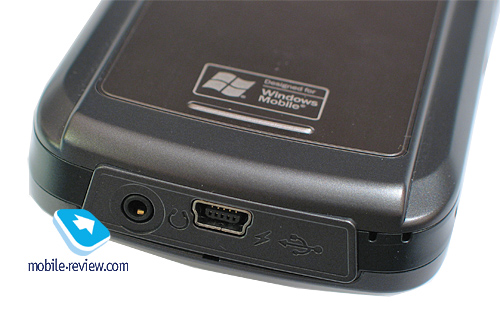 На нижнем торце сосредоточены все остальные разъемы коммуникатора. Это MiniUSB для подключения кабеля или зарядного устройства, а также 2.5 мм разъем для подключения гарнитуры. В левой части корпуса здесь располагается ушко для крепления шнурка. Последний закрепляется при открытой крышке аккумуляторного отсека.