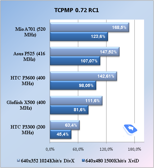 Далее тестируем аппарат с помощью бенчмарка, встроенного в видеоплеер TCPMP. Результат, равный 100%, говорит о том, что видео в указанном разрешении и качестве будет проигрываться на КПК без заметных «притормаживаний», выпадение кадров возможно лишь в динамичных сценах. Значение выше 120-130% означает, что мощности аппарата хватит для безупречного (без зависаний и выпадения кадров) проигрывания видео указанного разрешения и качества.