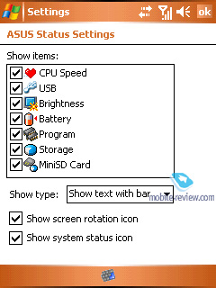 ASUS Status – модуль для отображения иконки с системной информацией на экране Сегодня (Today). В закрытом виде представляют собой значок в виде буквы A. Нажатие на эту иконку вызывает в левом нижнем углу всплывающее окно с системной информацией: режим подключения USB, режим работы процессора, уровень подсветки, количество памяти и заряд батареи. Любой из этих пунктов можно удалить по желанию.