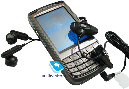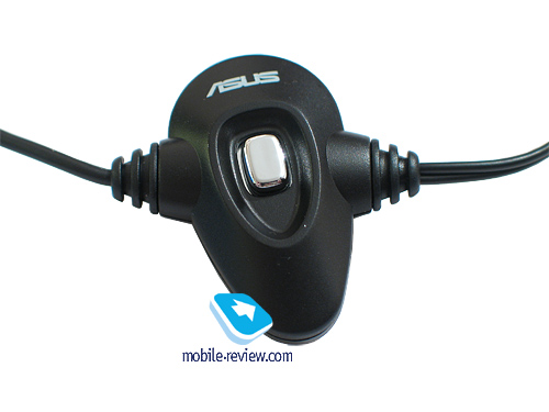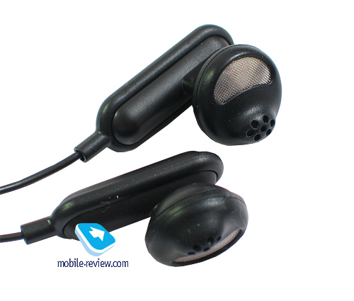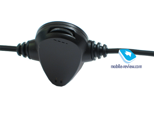 Комплектная гарнитура сделана оригинально. Радует, что в компании используют более-менее интересное решение, не прибегая к китайской поделке, встречающейся во многих моделях от E-Ten, Voxtel или последних i-Mate. Наушники выполнены в форме вкладышей, половинка вставляющейся в ухо части прорезинена и имеет небольшой выступ для более надежного крепления в ухе. На блоке с микрофоном расположена кнопка ответа на вызов, а также механическое колесико регулировки громкости. Также на проводе есть небольшая прищепка.