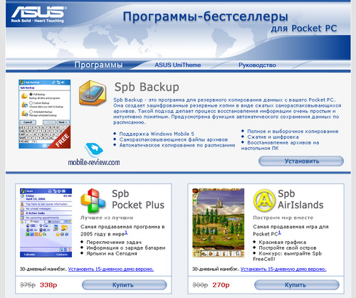 Комплект коммуникатора хотя и не включает каких-то неординарных вещей, но оставляет приятное впечатление. Сюда вошли все аксессуары первой необходимости, включая гарнитуру и чехол. Не хватает лишь пары запасных стилусов, в случае Asus P525 они были бы кстати. Отдельно отметим набор дополнительного ПО, это диск с мобильной версией Skype, а также диск с набором программ от Spb. Каждую программу можно установить на демонстрационный период (15 дней), здесь же можно найти полную версию приложения Spb Backup для резервного копирования данных. На третьем дополнительном диске располагается набор приложений от компании Paragon Software.