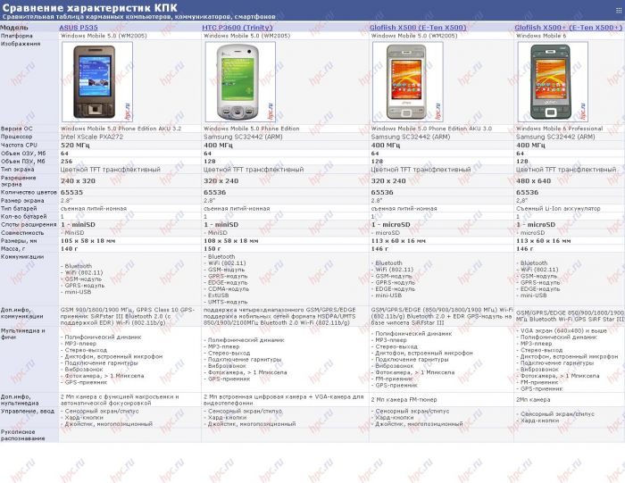 Сравнивать героя нашего сегодняшнего обзора мы будем с младшим братом Glofiish X500, а также с GPS-коммуникатором ASUS P535 и с HTC 3600 (Trinity), который скоро должен появиться в продаже. Прямых конкурентов у Glofiish X500+ на сегодняшний день нет, если говорить о коммуникационных возможностях и разрешении экрана. Тем не менее сравним наиболее близкие по оснащенности коммуникаторы, спецификации которых приведены в таблице ниже.