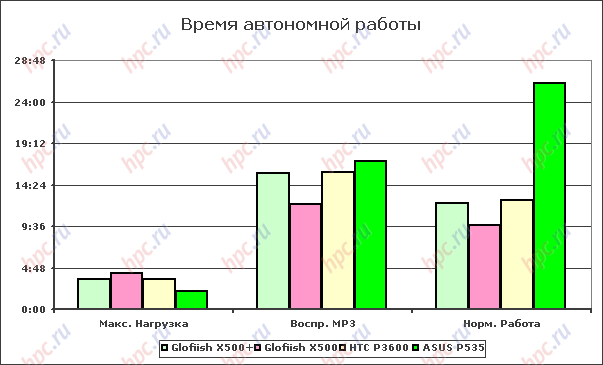 Отставание от младшей модели в режиме максимальной нагрузки предсказуемо, ведь X500+ приходилось циклически воспроизводить более «тяжелый» видеоролик, соответствующий разрешению экрана коммуникатора. В более щадящих режимах X500+ показал результаты, даже превосходящие X500. В целом, результаты неплохие, учитывая характеристики нового устройства. Конечно, на фоне показателей ASUS P535, достижения нашего героя не выглядят впечатляющими, коммуникаторы ASUS по праву считаются лидерами по времени автономной работы.