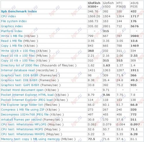 Теперь посмотрим на результаты, полученные в результате тестирования X500+ пакетом Spb Benchmark. Данные по HTC P3600 были взяты из январского обзора, когда в тестовой лаборатории оказался предсерийный образец коммуникатора. Как известно эта модель пока так и не поступила в продажу. Тем не менее, для общего представления о быстродействии устройства, данные подойдут.