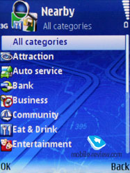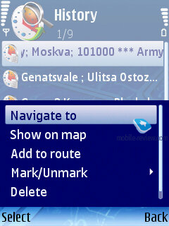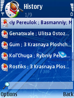 Поиск. Позволяет провести поиск нужного объекта по нескольким параметрам. Для использования поиска по имени и адресу нужно немного потренироваться. То есть понять, каким образом транскрибируются русские названия в их английский эквивалент. Для имен «Moskow» и «Moscow» результаты поиска будут отличаться. Одновременно на экране показывается расстояние до найденного объекта и его адрес. Каждый найденный объект сопровождается своей иконкой, указывающей на принадлежность к той или иной категории. Прямо из окна результатов поиска к объекту можно перейти по карте, проложить до него маршрут из текущей точки или рассортировать все найденные объекты по алфавиту или по расстоянию до них.