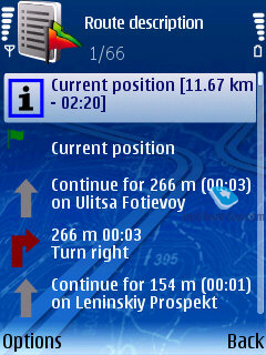 Планировка маршрута. Для прокладки маршрута из одной точки в другую необходимо выбрать начальную и конечную точки. Ими могут служить данные ориентиров, адреса, точки из путеводителя. После установления маршрута движения можно ввести дополнительные настройки – выбрать тип движения (на машине или пешком), установить скорость демонстрации маршрута, разрешить движение через дополнительные объекты. В их число входят платные дороги, так что при желании можно запретить их учет при прокладке маршрута движения. Здесь же можно просмотреть проложенный маршрут. При выборе пункта «Показать маршрут» программа автоматически выбирает кратчайший путь, отмечает ориентиры движения и просчитывает общее расстояние от одного объекта до другого. После прокладки маршрута его можно воспроизвести на экране в режиме симуляции. Пример такого маршрута приведен в прилагаемом ролике. Маршрут сопровождается голосовыми подсказками. Подсказки на русском языке можно загрузить из меню общих настроек. Во время движения можно отключить сопровождение курсора и посмотреть информацию о близлежащих достопримечательностях, которые отмечены на карте значками. Возврат к сопровождению вызывается правой софтверной клавишей.