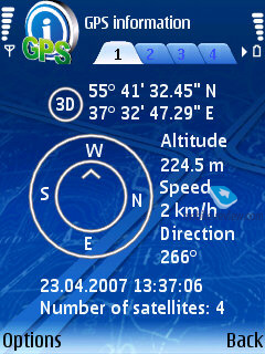 Программа позволяет демонстрировать объекты на карте и во время движения в псевдотрехмерном виде. Переключение в этот режим происходит при нажатии на клавишу «0». Можно менять цвет карты и просматривать состояние спутников.