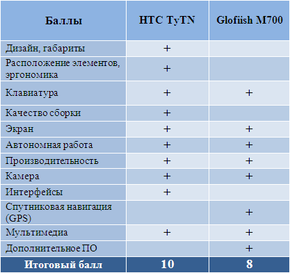 Отставание M700 от TyTN составляет всего 2 балла. На стороне HTC TyTN габариты, более надежный по субъективным ощущениям и многим отзывам корпус, более продуманное расположение клавиш и управляющих элементов (эргономика). На стороне M700 GPS, который кому-то один или несколько раз может пригодиться, и неоспоримый плюс в виде богатого набора предустановленных программ.