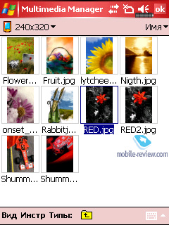 Multimedia Manager – утилита для просмотра изображений. От стандартной программы «фото и видео» отличается возможностью удобного пролистывания изображений, полноэкранным просмотром (не только в режиме слайд-шоу), а также возможностью передачи просматриваемого изображения в одну из программ для дальнейшего редактирования или отправки: Image Maker, Image Wizard, SMS, MMS.