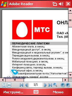 Adobe Reader LE – наиболее распространенная программа для просмотра PDF-документов, это ее мобильная версия. Как и старший брат, программа отличается неторопливостью. Загрузка страницы с текстом занимает порядка 10-15 секунд, если же документ изобилует картинками или схемами, то каждая страница подгружается по полминуты и более. Стоит заметить, что для просмотра небольших файлов и просто краткого ознакомления с ними возможностей программы более чем достаточно.
