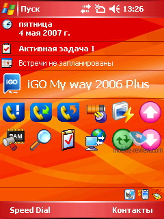 Стандартный интерфейс экрана “Today” имеет ряд фирменных надстроек. Речь идет о плагине Quick Link. Он позволяет осуществлять быстрый запуск программ и основных настроек, доступ к ним возможен со стартового экрана. Также в самой нижней части стартового экрана расположены две иконки. Одна служит для быстрого доступа к профилям, другая вызывает настройки беспроводных адаптеров (Wireless Manager). Помимо этого, на экран можно вывести индикатор заряда батареи, он располагается под часами.