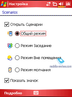 Scenarios – при помощи этой надстройки можно настроить профили. Всего доступно четыре профиля. Для каждого можно настроить громкость звонка, силу вибрации, а также уровень экранной подсветки. Как уже говорилось выше, для быстрого доступа к профилям значок программы можно вывести на экран “Today”, в нижнюю часть.