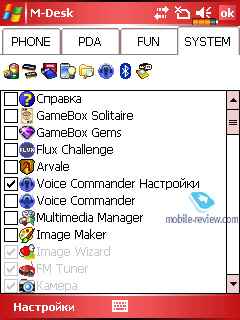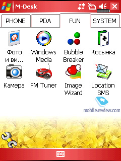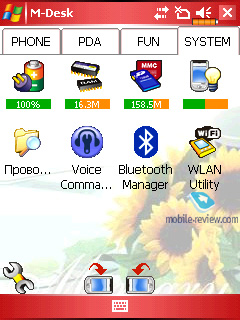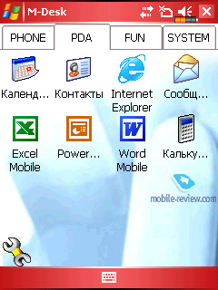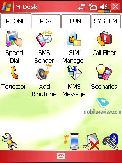 M-desk – Приложение служит для замены стандартного экрана “Today”. По умолчанию вызывается отдельной аппаратной клавишей над дисплеем. Это довольно красивая и приятная (хотя и слишком пестрая) оболочка для быстрого доступа к программам, настройкам. Внутри оболочки приложения разделены по вкладкам: Phone, PDA, Fun, System. В любую вкладку вы можете добавлять любое количество программ или удалять их.