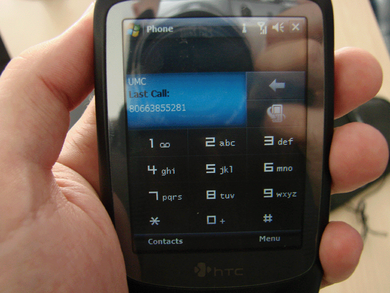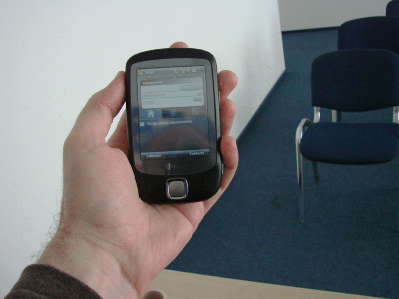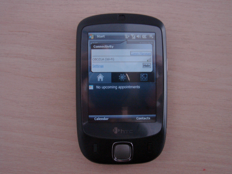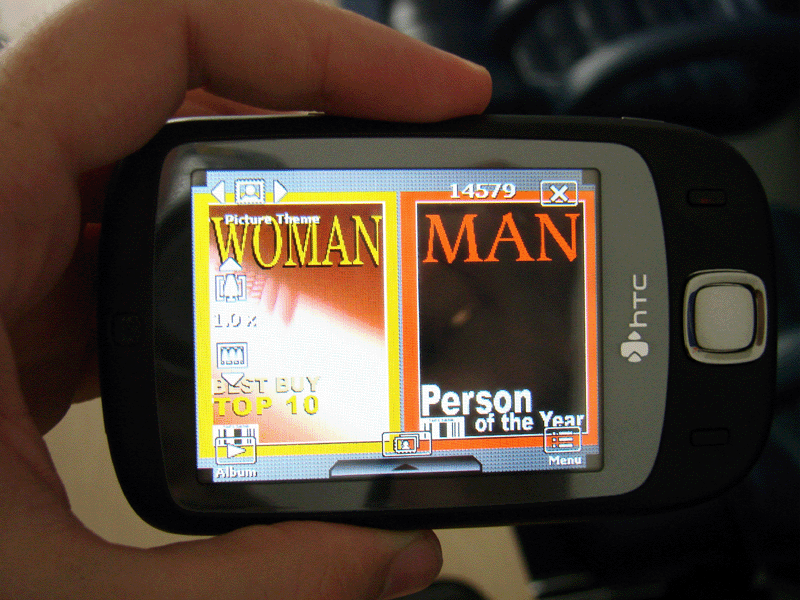 Хочется рассказать об этой технологии в самых первых строках обзора, поскольку TouchFLO – это главное отличие «эльфа» от собратьев. Стоит провести по экрану пальцем снизу вверх – и Вашему взору предстанет трехмерный рабочий стол в виде параллелепипеда, на каждой из сторон которого размещены ярлыки приложений. Первое окно содержит ярлыки на запуск шести приложений — email, SMS/MMS, Internet Explorer, Задачи, Comm Manager и Календарь. Второе — три ярлыка для запуска мультимедийных приложений: Музыка, Фото и Видео. На третьей стороне – окошки, в которые можно добавлять активные контакты адресной книги с фотографиями. Параллелепипед поворачивается при проведении пальца справа налево или наоборот. Ярлыки довольно крупные, нажимаются пальцем. Возможности замены ярлыков программа не предполагает.