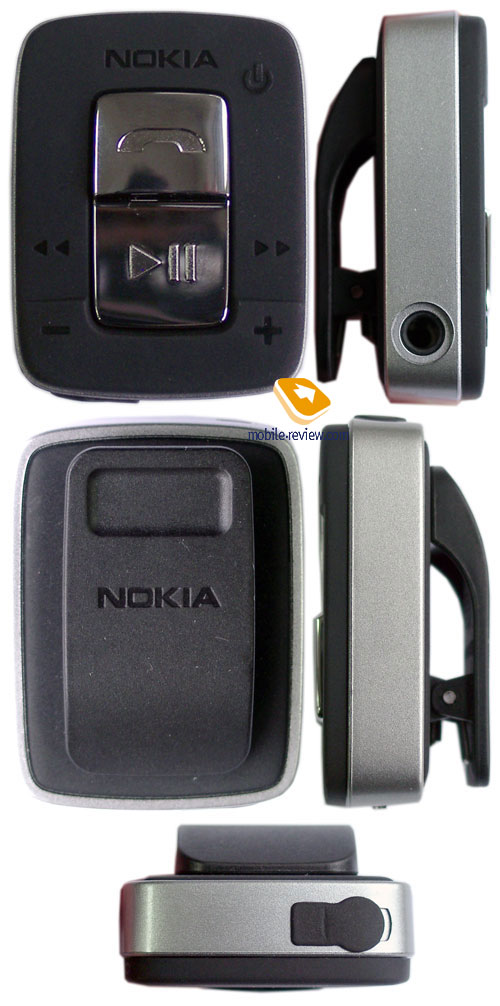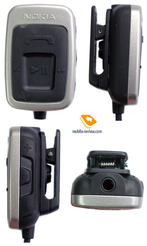 Теперь перейдем к HS-29, это гарнитура из комплекта крайне любопытного аппарата Nokia 5500, который сейчас является моим основным телефоном. HS-29 гораздо интереснее HS-8, лично я ждал, что в комплект с 5500 попадет именно последняя, однако надо отдать должное всем тем людям в Nokia, кто продумывал комплект телефона – здесь практически все «эксклюзивно»: это и специальный держатель с клипсой, и уже упомянутая гарнитура (был искренне удивлен, увидев, что она оснащена пультом ДУ). Поговорим о нем. Конструктивно HS-29 состоит из двух компонентов – это шнур с разъемом на одном конце и пультом ДУ с разъемом 3.5 мм на другом, а также собственно наушники. Пульт ДУ крайне плотно собран, его тыльная сторона выполнена из твердой резины, там же находится и «крокодил» для крепления на одежде. На фронтальной части находится клавишный блок, он также обрезинен. Как видно на фотографиях, здесь есть кнопки приема/отбоя вызовов, перемотки вперед/назад, клавиша Play/Stop. На правом торце находятся клавиши регулировки громкости и кнопка активизации режима Push To talk. Все кнопки туговаты, к ним нужно приноровиться, возможно, поэтому здесь нет клавиши блокировки.