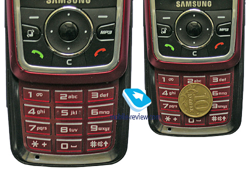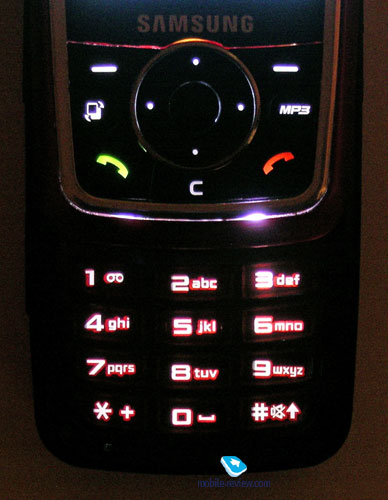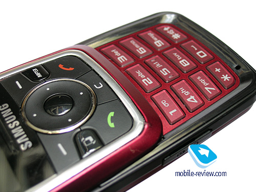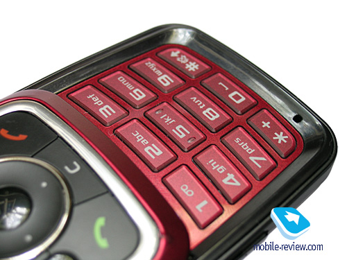 При открытии телефона становится доступна цифровая клавиатура. Она отличается от клавиш навигационного блока не только цветом (цифровые клавиши красные, как и поверхность между ними), но и компоновкой. Цифровые клавиши хорошо разнесены, так что при работе с ними ни о каких ошибочных нажатиях речи не идет.