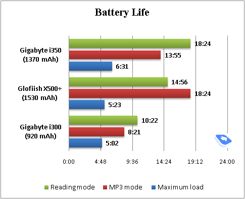 Показатели типичные для устройства с VGA-экраном, если судить по результатам glofiish X500+. Расстраивает низкое время работы в режиме прослушивания музыки. Наличие переходника для наушников в комплекте позволяет использовать модель в качестве плеера. По результатам тестов можно говорить о том, что увеличение емкости аккумулятора со времен выпуска Gigabyte i300 ожидаемо положительно сказалось на времени автономной работы.