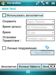 Answer Machine – автоответчик. Из настроек программы доступен выбор памяти для сохранения записей, их длительности (до 5 минут). В качестве приветствия можно выбрать стандартное или же записать свое непосредственно в этой программе.