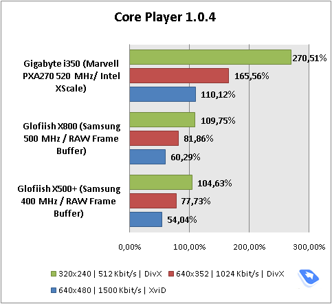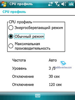 Результат закономерно высокий. Видео среднего качества без проблем будет воспроизводиться коммуникатором, с большинством неконвертированных видеофайлов также не возникнет сложностей. Интересная особенность: в коммуникаторе есть утилита «CPU профиль», которая позволяет выставить один из трех профилей работы процессора – энергосберегающий режим, обычный режим и максимальная производительность. На практике смена режимов не изменила ни результатов тестов на время автономной работы, ни тестов на производительность. Более того, при одинаковых показателях теста Core Player в режиме обычном и максимальной производительности в последнем режиме видео подтормаживало, и были ощутимые провалы в воспроизведении. Возможно, это связано с прошивкой или просто недоработанной утилитой.