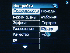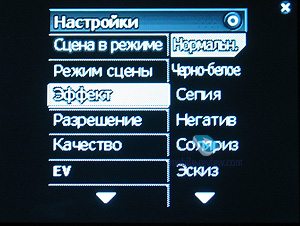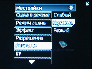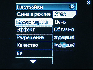 Главное меню появляется сразу в режиме видоискателя. Оно занимает центральную часть экрана. Подменю представлены выпадающими из основного меню окнами. Например, при выборе разрешения небольшое окно со списком разрешений появляется справа от основного меню. Такая организация удобна тем, что меню максимально упрощено. Здесь нет древовидной структуры или нагромождения окон. Есть функции, которые представлены вертикальным списком, и есть значения этих функций. В меню невозможно запутаться, а управлять им можно как пером, так и нажатиями пальцем.