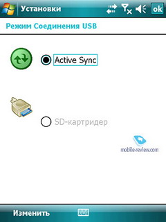 При подключении кабеля можно выбрать один из двух режимов: чтение карты памяти (Card reader) или подключение к программе синхронизации (ActiveSync).