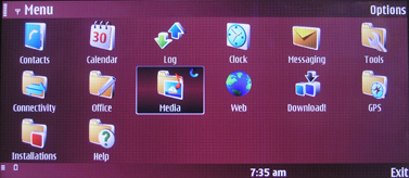 Меню телефонной части аппарата представлено в виде матрицы, доступны и другие варианты его оформления. К сожалению, любая тема используется для обоих экранов одновременно. Честно говоря, с имеющимися изначально в телефоне элементами оформления не развернёшься: все-таки, как бизнес-аппарат, Е90 имеет строгое внутреннее наполнение. Расположение элементов и работа с ними стандартны для S60, поэтому лишний раз останавливаться на этих деталях мы не будем. Из предустановленных приложений стоит отметить интересную для семейства аппаратов Nokia утилиту Team Suite, поисковик файлов в памяти устройства Nokia Search, просмотрщики документов Adobe PDF и Quick Office. Из коммуникационных возможностей в аппарате реализованы GPRS, EDGE, HSDPA, Wi-Fi. Для передачи данных также используются Bluetooth 2.0, ИК-порт и USB.