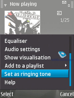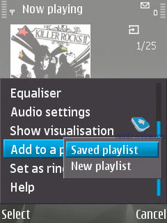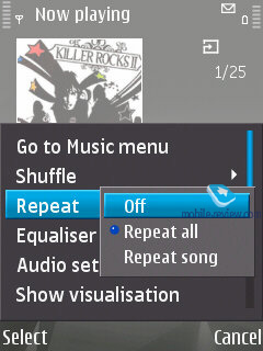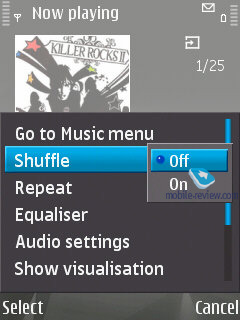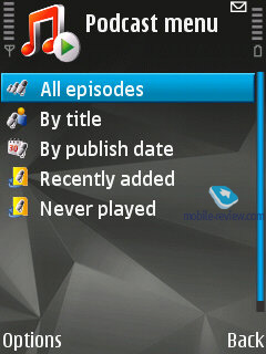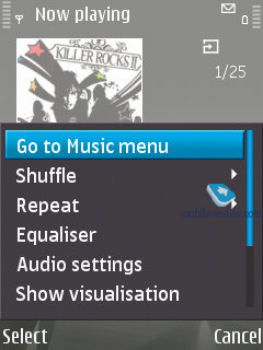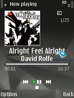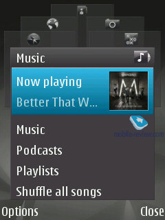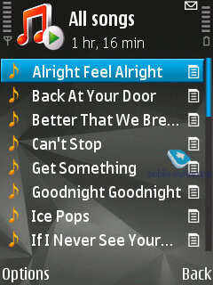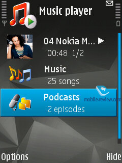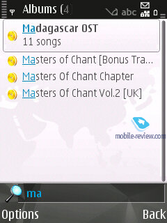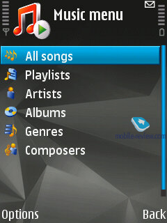 В музыкальном меню есть сортировка списка композиций по всем песням, плей-листам, исполнителям, альбомам, жанрам и композиторам. Музыкальная библиотека (читай список файлов) автоматически обновляется при синхронизации с ПК с использованием Nokia PC Suite, если же вставлять карту с записанными композициями, то этого не происходит. Интересна опция просмотра общей информации о музыкальной библиотеке.
