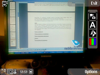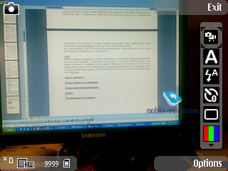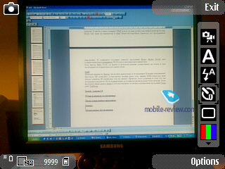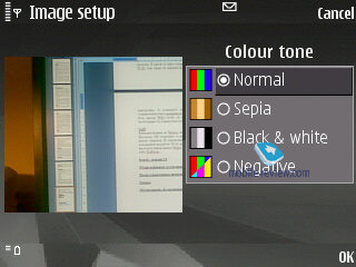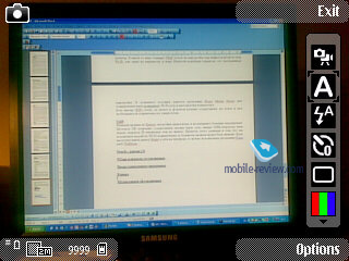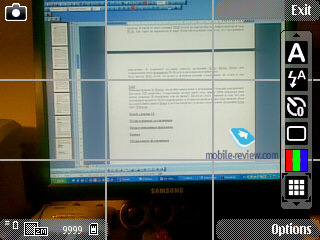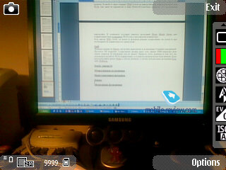 В настройках доступен выбор разрешения снимка – 1600х1200, 1152х764 и 320х240 точек. Вариант съемки – обычный, серия снимков, таймер (10, 20 или 30 секунд). Присутствует ночной режим, возможность настройки баланса белого – Sunny, Incandescent, Fluorescent. Настройки цвета стандартны, это своего рода эффекты – Sepia, Black&White, Negative. Вспышка в аппарате светодиодная. Во время съемки перемещением навигационной клавиши активируется зум, он цифровой. Использовать зум не имеет смысла, так как во встроенном редакторе можно увеличить обычный снимок и в режиме просмотра, а его качество при этом будет выше.