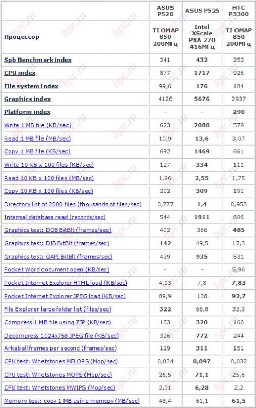 С целью выяснения общей производительности системы традиционно использовался тестовый пакет Spb Benchmark от компании Spb Software House. Для сравнения были выбраны модели ASUS P525 (для оценки разницы быстродействия между тем, что "было" и тем, что "стало") и HTC P3300 (Artemis) – как ближайший конкурент и самый близкий по техническим параметрам коммуникатор.