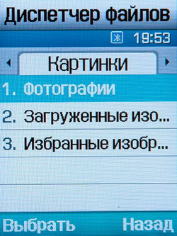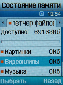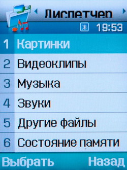Диспетчер файлов содержит все данные, содержащиеся в памяти телефона (73 Мб) и на карте памяти, а именно: картинки, видео, музыку, звуки, другие файлы.