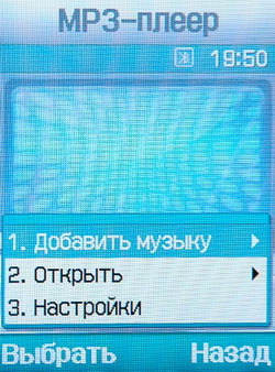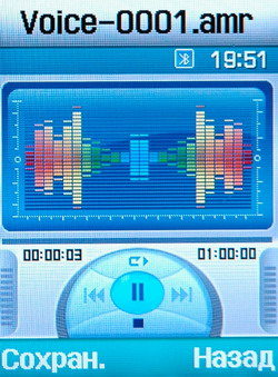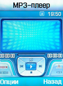 MP3-плеер весьма удобен. Можно проигрывать треки в режиме повтора и назначить случайный порядок воспроизведения. Присутствуют настройки графического эквалайзера с предустановленными режимами (рок, нормальный, классика, джаз). Пользователь может составлять свои плейлисты. Здесь же можно записать звуковой фрагмент в формате *.AMR, который также сохранится в памяти и будет доступен из телефона.
